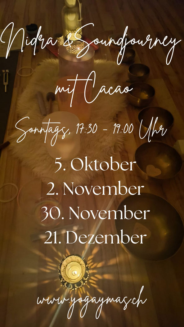Wir starten mit einem herzöffnenden Cacao, entspannen dann im Yoga Nidra und schliessen mit einem Soundbath ab. Begleitet von der wundervollen Reiki Energie.
